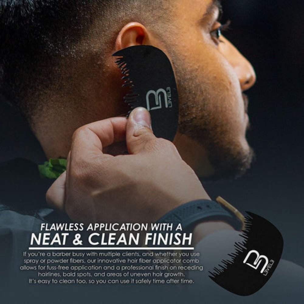 Applying hair fibers needn’t be tricky or time-consuming. All you need is a smart tool that’s specially designed for even distribution and a neat, natural-looking hairline. If you’re a barber busy with multiple clients, that tool must be easy to use and deliver on its promise of flawless coverage. Whether you use spray or powder fibers, our innovative hair fiber applicator comb does all of the above. It allows for fuss-free application and a professional finish on receding hairlines, bald spots, and areas of uneven hair growth. It’s easy to clean too, so you can use it safely time after time.