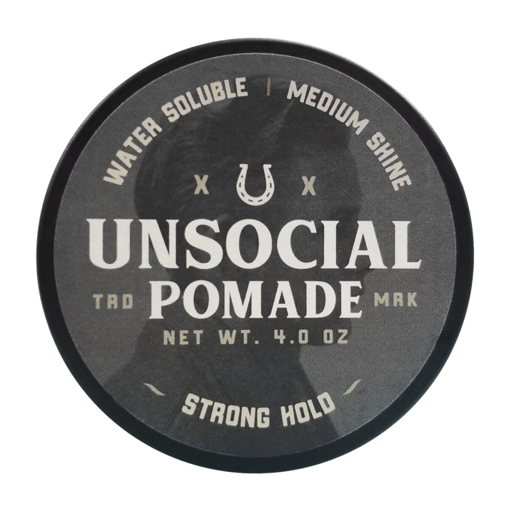 Unsocial Co’s Pomade is a solid all day hold Water Soluble Pomade with Dead Sea Minerals, Jojoba Oil and Green Tea Extract promoting hydrated, strong Hair and a healthy scalp.